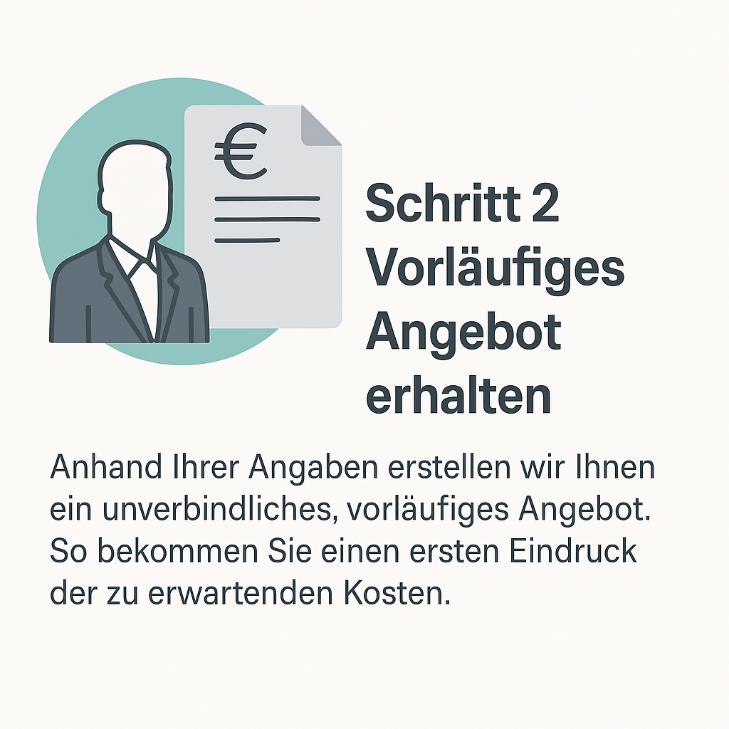 Anhand Ihrer Angaben erstellen wir Ihnen ein unverbindliches, vorläufiges Angebot. So bekommen Sie schnell einen ersten Eindruck der zu erwartenden Kosten – ohne Verpflichtungen.