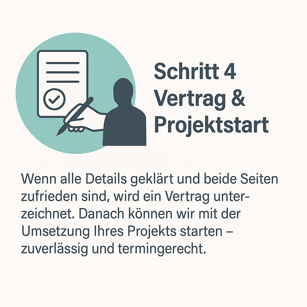 Wenn alle Details geklärt und beide Seiten zufrieden sind, wird ein Vertrag unterzeichnet. Danach können wir mit der Umsetzung Ihres Projekts starten – zuverlässig und termingerecht.
